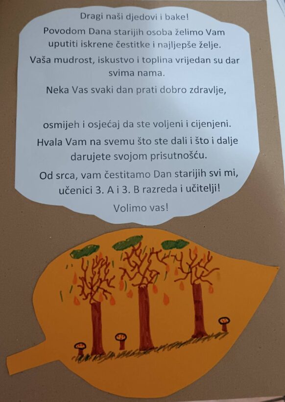 Na kraju posjeta domu za starije, učenici su korisnicima uručili čestitke koje su sami izradili na satu likovne kulture. Ručno izrađene poruke pažnje i ljubavi posebno su razveselile domaćine. Kao znak zahvalnosti, djelatnici i korisnici doma počastili su djecu slasnim zalogajima i druženjem koje je dodatno učvrstilo lijep dojam ovog susreta.