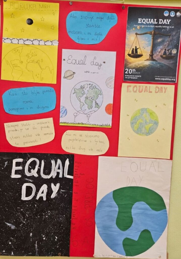 Učenici 6.a razreda ove su godine sudjelovali u događaju Equal Day 2026., s ciljem poticanja mira, raznolikosti, jedinstva i empatije. 20. ožujka ekvinocij je označavao trenutak kada su dnevno svjetlo i tama bili u savršenoj ravnoteži – prirodni sklad koji odražava vrijednosti jednakosti, mira i jedinstva.