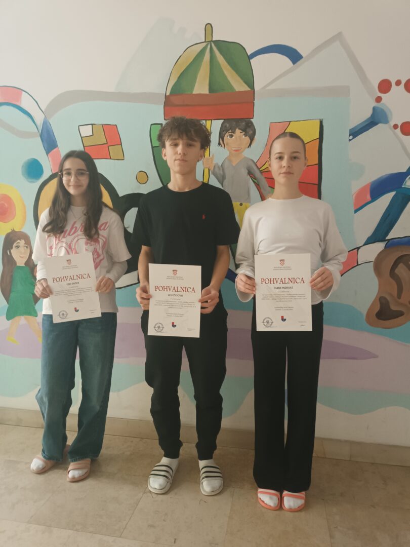 Tema ovogodišnjeg natjecanja, „S one strane vidljivoga“, potaknula je učenike na istraživanje vlastitog svijeta mašte, snova i osjećaja, gdje su kroz umjetnički izraz prikazali ono što se ne vidi očima, već doživljava srcem. Na izložbi su svoje radove predstavili naši učenici Ema Sačer, Leo Židov i Hana Horvat, kojima čestitamo na kreativnosti, trudu i uspješnom predstavljanju škole. Mentorica učenika je učiteljica likovne kulture Lea Šlibar. Bravo za naše mlade umjetnike!