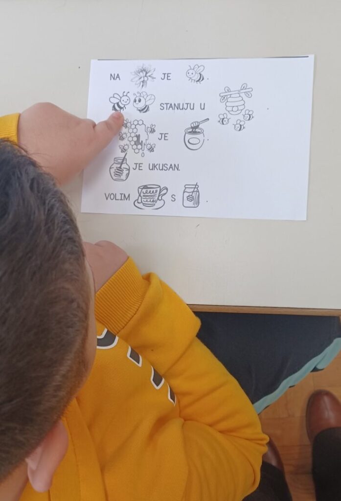 Djeca su poslušala poučnu priču o pčelama ,pogledali su kratku prezentaciju i razgovarali o tome kako nastaje med. Nakon toga su rješavali zadatke , čitali rečenice i crtali na temu pčela. Za kraj, učenici su dobili male poklon –paketiće staklenku meda i edukativnu slikovnicu. Dan je protekao u vedrom i poučnom raspoloženju, a učenici su naučili koliko je važno čuvati pčele i uživati u prirodnim proizvodima.