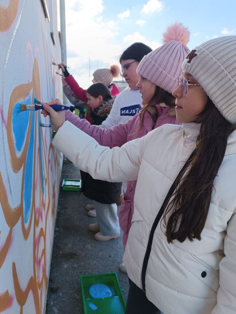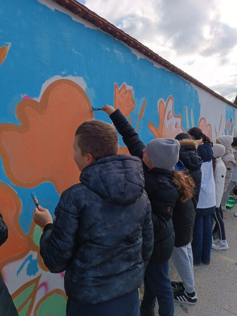 Ovaj mural prethodno je skicirala umjetnica Rusa Trajkova, a naši učenici pridružili su se umjetnici u oslikavanju. Vrijedne ruke naših učenika dale su novo ruho ovo unikatnom umjetničkom djelu. Učenici su se prvi puta okušali u ovakvom formatu i bili dio tima koji uljepšava vizualni identitet našega grada. Mural prikazuje najvažnije simbole grada i zajednice, a ostaje na ponos generacijama.