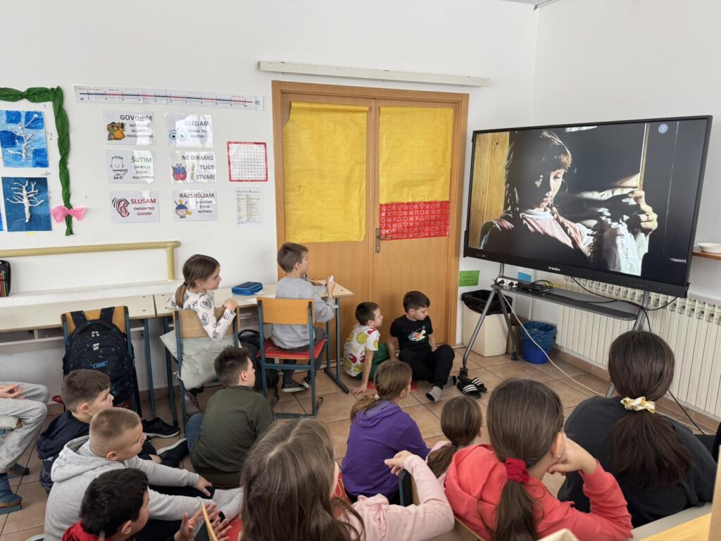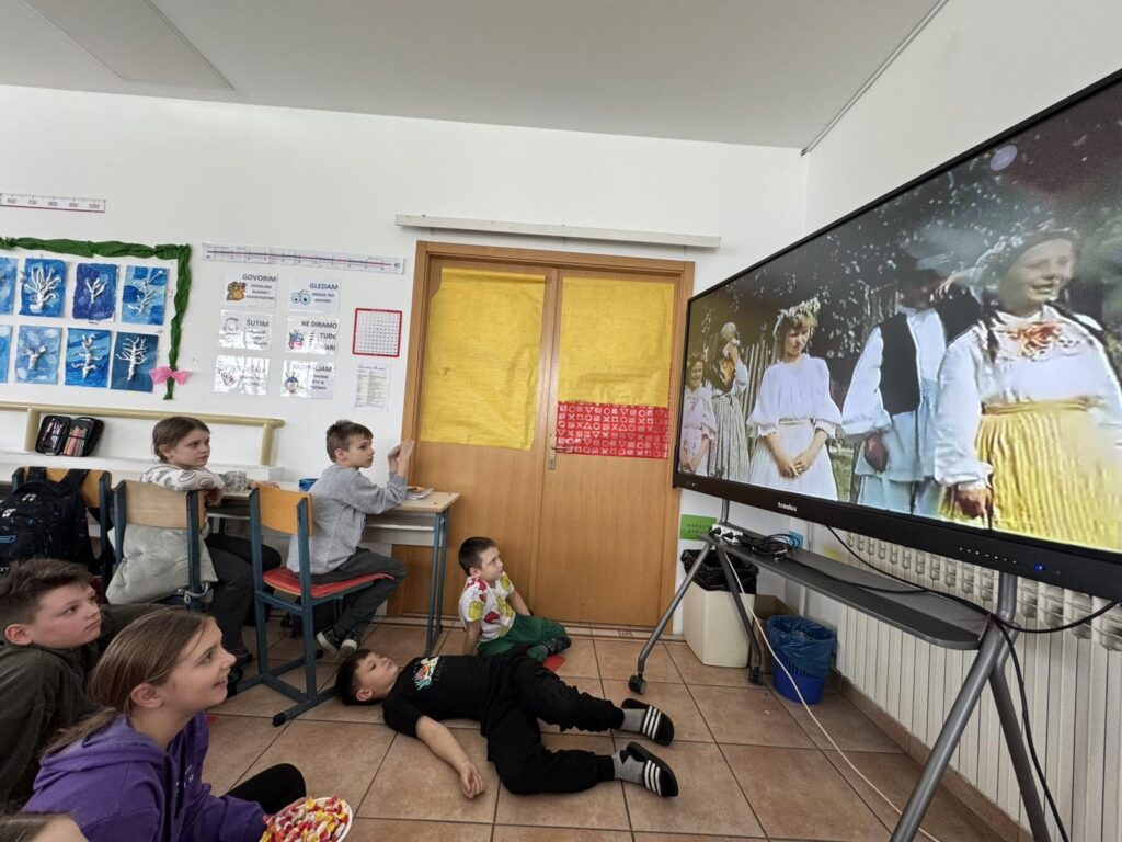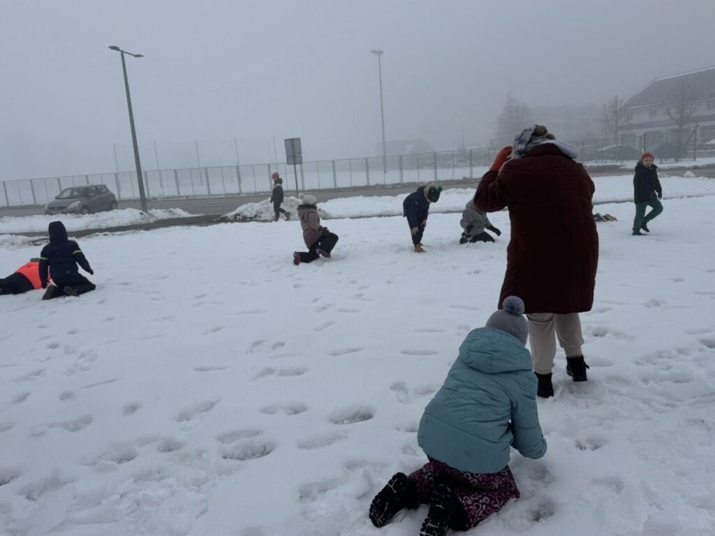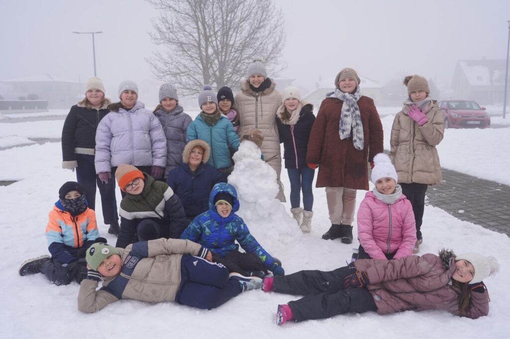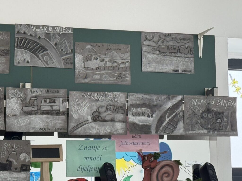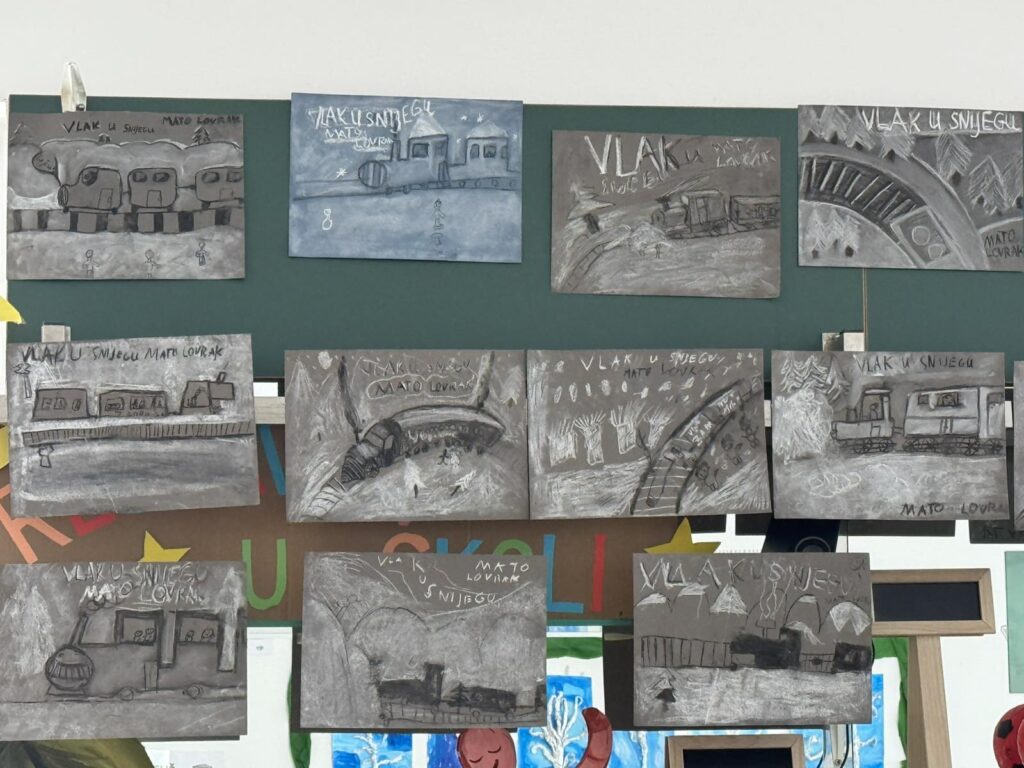 Inspiracija su nam bili sadržaji o Zdravlju gdje je važna tjelovježba i boravak na svježem zraku. Igre na snijegu: od građenja, klizanja i grudanja. Usvajanje djela za cjelovito čitanje Vlak u snijegu, Mate Lovraka. Iz likovne kulture izrađivali smo naslovnicu za dječji roman Vlak u snijegu tehnikom ugljena i krede, izradom svjetlijih i tamnijih tonova crtanjem crta po karakteru.